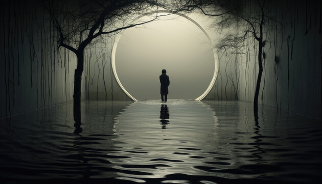 Ceci est le plan de l’idée et passons un temps dans le plan de la forme, là dans cet océan où tout se reflète et donc où tout s’inverse. Ici, il n’y a que projection de notre verticalité, mais nous, nous ne voyons que la forme inversée qu’il y a, à notre niveau. Nous sommes ici-bas, dans ces eaux usées et tourbillonnantes, enfermés dans ses flux, et ses mouvements. Nous ne savons pas, bien sûr, que tout ce que nous voyons n’existe pas.