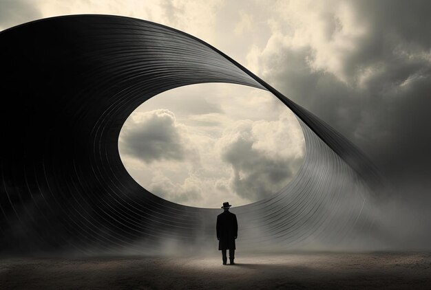 Nous sommes des êtres verticaux, des traits provenant d’un point, d’une ouverture, d’un vide. Ceci est l’idée de départ, afin de comprendre les idées générales, qui en découleront. Tout suit cette dynamique, tout par d’un point, d’une ouverture, descend verticalement, et œuvre horizontalement à travers un tore, ou une spirale afin d’exprimer et d’expérimenter ce « tout en un ».